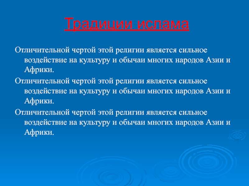 Отличительной чертой этой религии является сильное воздействие на культуру и обычаи многих народов Азии и Африки.
