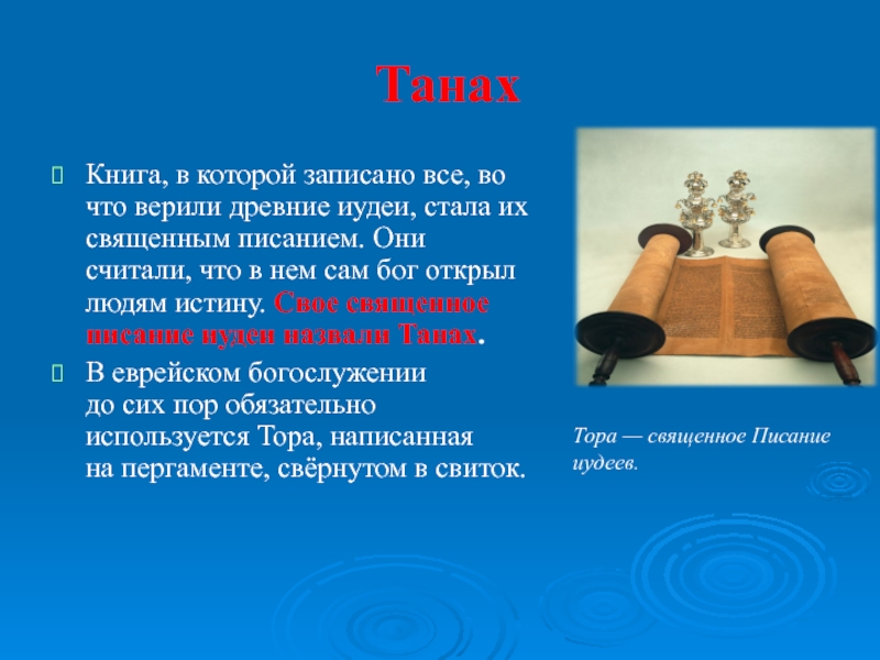 их священным писанием. Они считали, что в нем сам бог открыл людям истину. Свое священное писание иудеи назвали Танах.