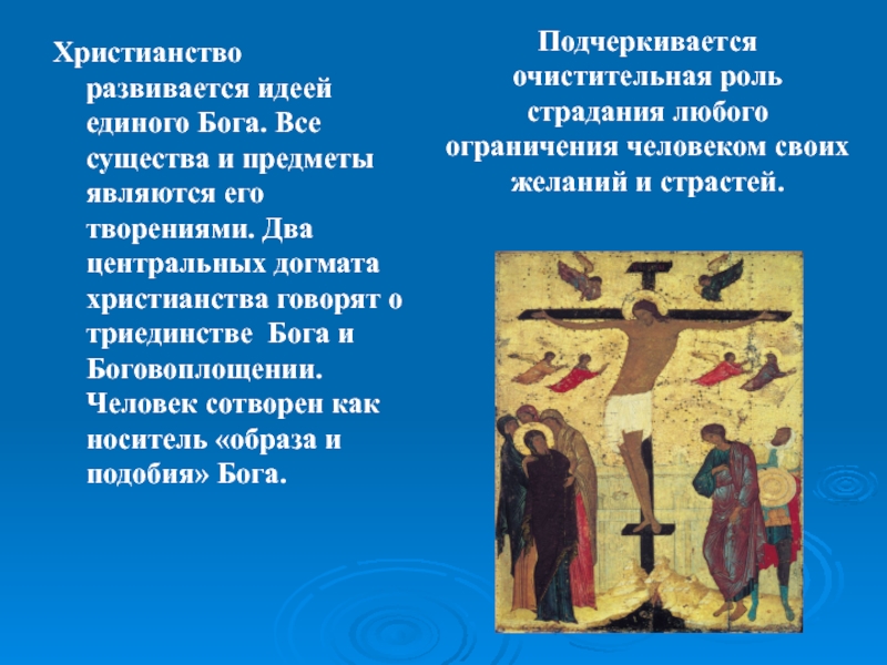 развивается идеей единого Бога. Все существа и предметы являются его творениями. Два центральных догмата христианства говорят о триединстве Бога и Боговоплощении. Человек сотворен как носитель «образа и подобия» Бога.