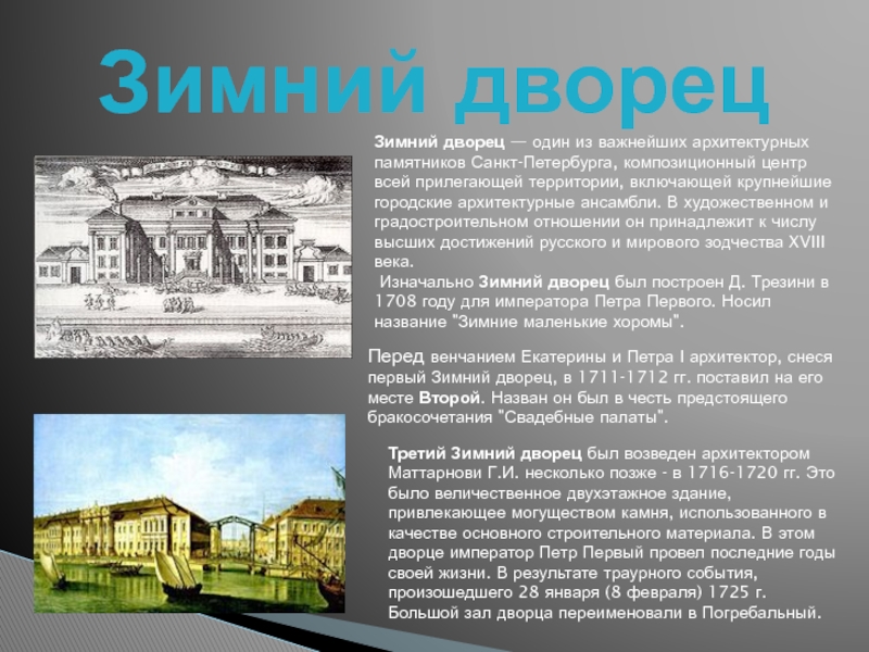 Третий Зимний дворец был возведен архитектором Маттарнови Г.И. несколько позже - в 1716-1720 гг. Это было величественное двухэтажное здание, привлекающее могуществом камня, использованного в качестве основного строительного материала. В этом дворце император Петр Первый провел последние годы своей жизни. В результате траурного события, произошедшего 28 января (8 февраля) 1725 г. Большой зал дворца переименовали в Погребальный.