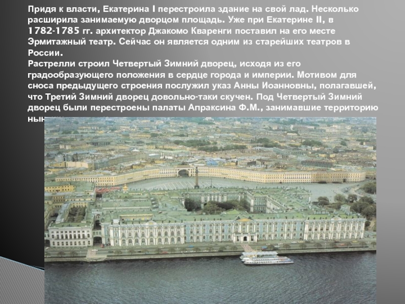 Перед венчанием Екатерины и Петра I архитектор, снеся первый Зимний дворец, в 1711-1712 гг. поставил на его месте Второй. Назван он был в честь предстоящего бракосочетания "Свадебные палаты".
