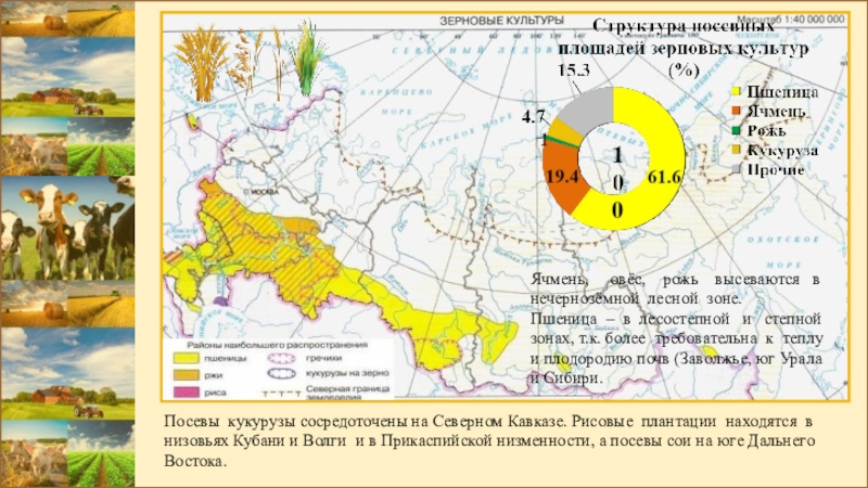 Посевы кукурузы сосредоточены на Северном Кавказе. Рисовые плантации находятся в