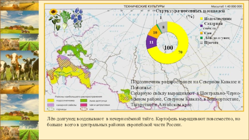 Лён-долгунец возделывают в нечернозёмной тайге. Картофель выращивают повсеместно, но