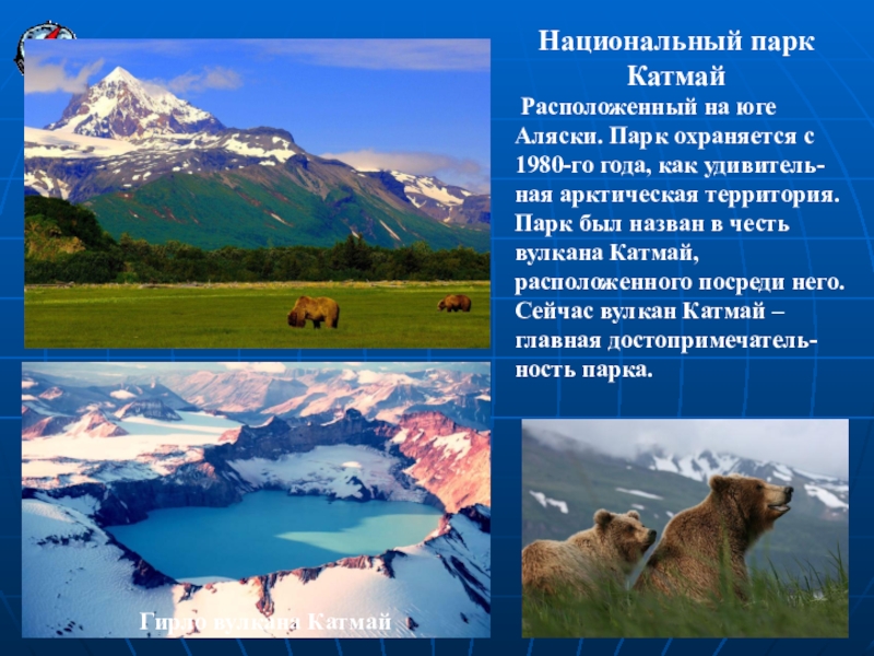 удивитель-ная арктическая территория. Парк был назван в честь вулкана Катмай, расположенного посреди него. Сейчас вулкан Катмай – главная достопримечатель-ность парка.