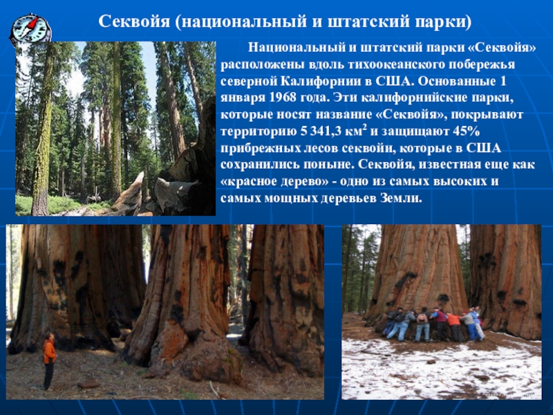 тихоокеанского побережья северной Калифорнии в США. Основанные 1 января 1968 года. Эти калифорнийские парки, которые носят название «Секвойя», покрывают территорию 5 341,3 км2 и защищают 45% прибрежных лесов секвойи, которые в США сохранились поныне. Секвойя, известная еще как «красное дерево» - одно из самых высоких и самых мощных деревьев Земли.
