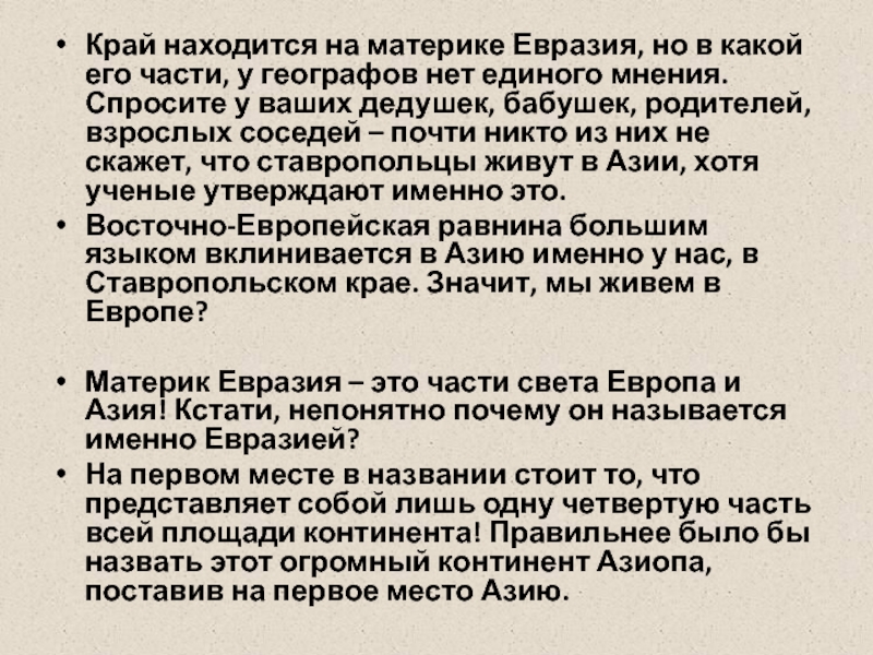 Географические координаты края легко запомнить: через главный город нашего края Ставрополь проходит 45 параллель Северного полушария.