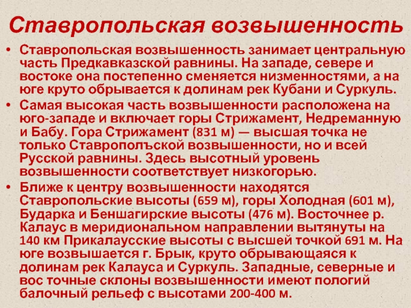 равнины. Наивысшая точка — гора Стрижамент (831 м). Административно возвышенность расположена в пределах Ставропольского края, а также частично в восточной части Краснодарского, крайнем западе Республики Калмыкии.