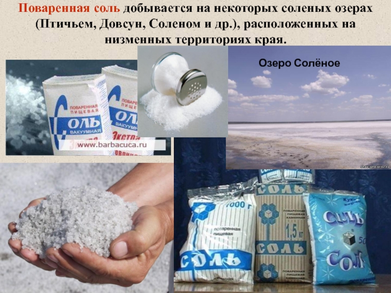 Поваренная соль добывается на некоторых соленых озерах (Птичьем, Довсун, Соленом и