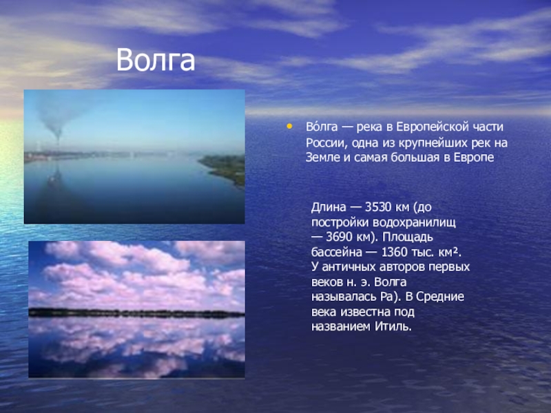 Длина — 3530 км (до постройки водохранилищ — 3690 км). Площадь бассейна — 1360 тыс. км². У античных авторов первых веков н. э. Волга называлась Ра). В Средние века известна под названием Итиль.