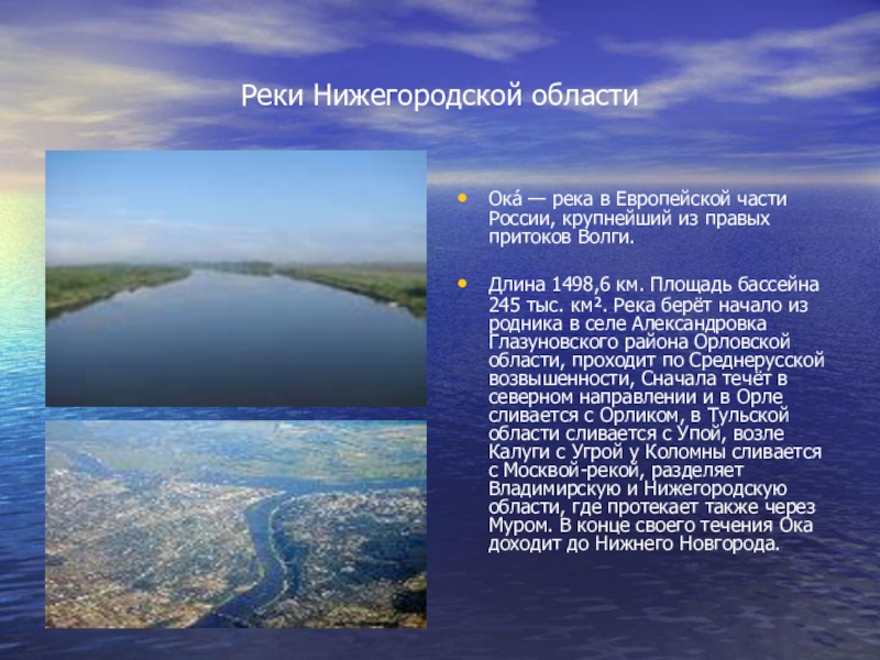 Длина 1498,6 км. Площадь бассейна 245 тыс. км². Река берёт начало из родника в селе Александровка Глазуновского района Орловской области, проходит по Среднерусской возвышенности, Сначала течёт в северном направлении и в Орле сливается с Орликом, в Тульской области сливается с Упой, возле Калуги с Угрой у Коломны сливается с Москвой-рекой, разделяет Владимирскую и Нижегородскую области, где протекает также через Муром. В конце своего течения Ока доходит до Нижнего Новгорода.
