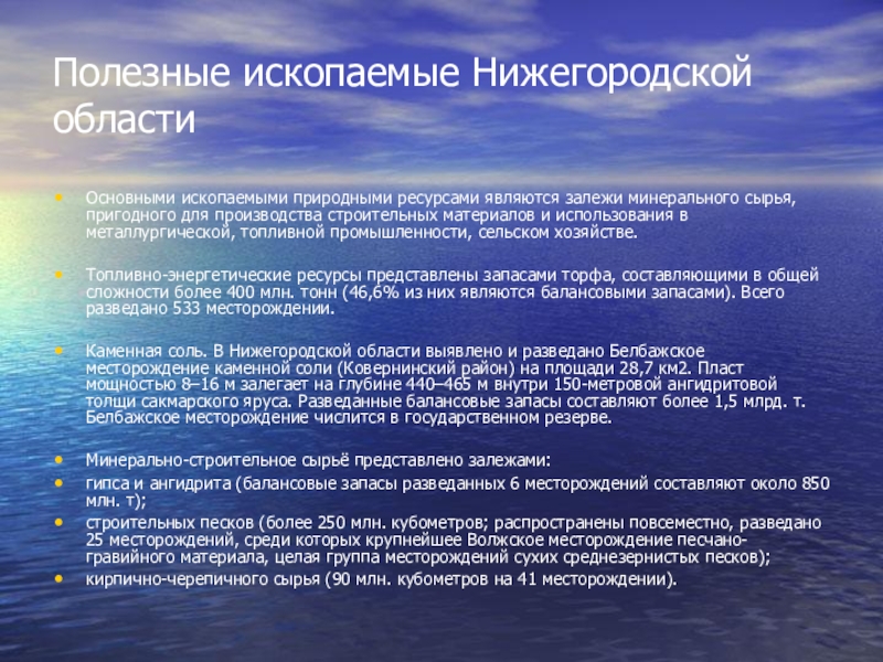 Каменная соль. В Нижегородской области выявлено и разведано Белбажское месторождение каменной соли (Ковернинский район) на площади 28,7 км2. Пласт мощностью 8–16 м залегает на глубине 440–465 м внутри 150-метровой ангидритовой толщи сакмарского яруса. Разведанные балансовые запасы составляют более 1,5 млрд. т. Белбажское месторождение числится в государственном резерве.