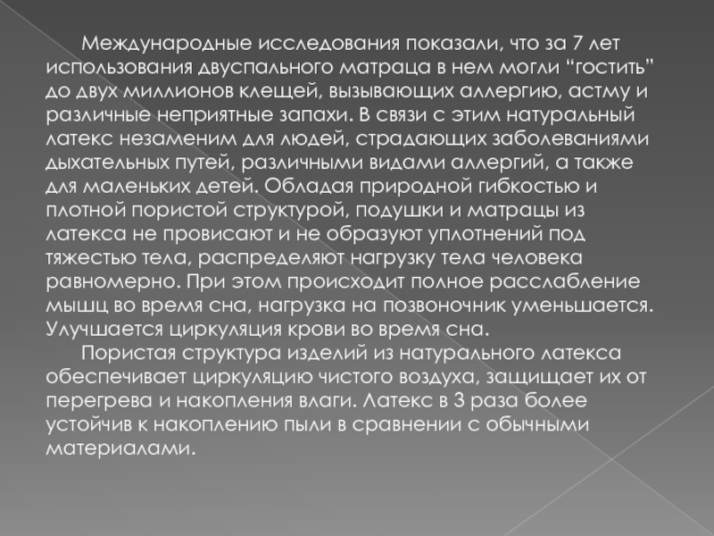 Слайд 87Международные исследования показали, что за 7 лет использования двуспального матраца в