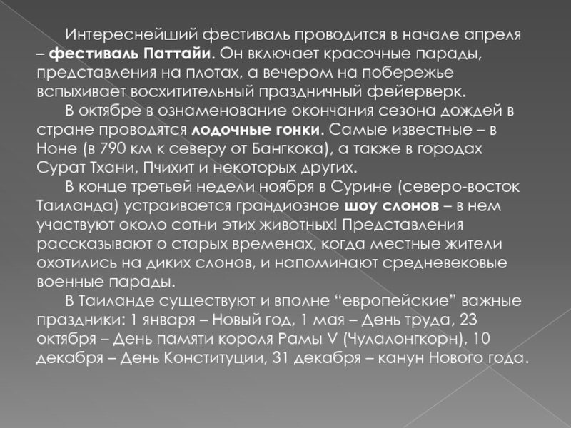 Слайд 68Интереснейший фестиваль проводится в начале апреля – фестиваль Паттайи. Он включает