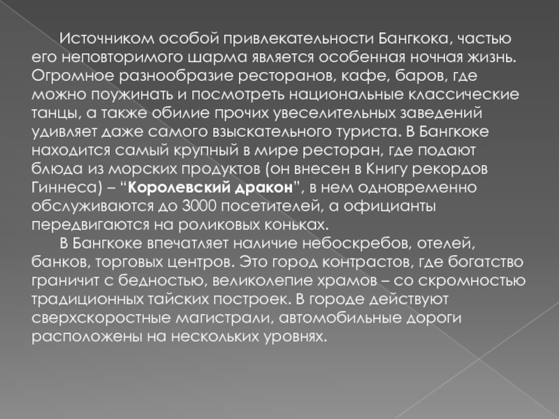 жизнь. Огромное разнообразие ресторанов, кафе, баров, где можно поужинать и посмотреть национальные классические танцы, а также обилие прочих увеселительных заведений удивляет даже самого взыскательного туриста. В Бангкоке находится самый крупный в мире ресторан, где подают блюда из морских продуктов (он внесен в Книгу рекордов Гиннеса) – “Королевский дракон”, в нем одновременно обслуживаются до 3000 посетителей, а официанты передвигаются на роликовых коньках.