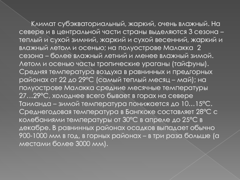 страны выделяются 3 сезона – теплый и сухой зимний, жаркий и сухой весенний, жаркий и влажный летом и осенью; на полуострове Малакка 2 сезона – более влажный летний и менее влажный зимой. Летом и осенью часты тропические ураганы (тайфуны). Средняя температура воздуха в равнинных и предгорных районах от 22 до 29°С (самый теплый месяц – май); на полуострове Малакка средние месячные температуры 27…29°С, холоднее всего бывает в горах на севере Таиланда – зимой температура понижается до 10…15°С. Среднегодовая температура в Бангкоке составляет 28°С с колебаниями температуры от 30°С в апреле до 25°С в декабре. В равнинных районах осадков выпадает обычно 900-1000 мм в год, в горных районах – в три раза больше (а местами более 3000 мм).