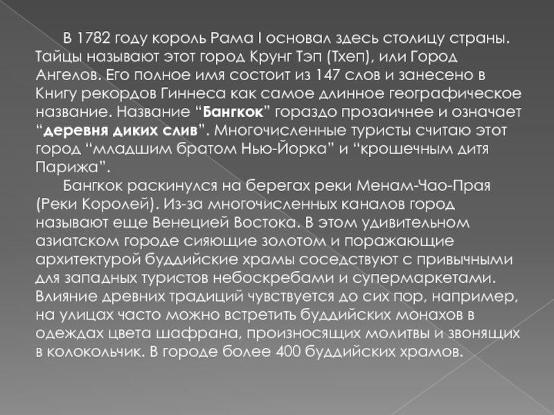 называют этот город Крунг Тэп (Тхеп), или Город Ангелов. Его полное имя состоит из 147 слов и занесено в Книгу рекордов Гиннеса как самое длинное географическое название. Название “Бангкок” гораздо прозаичнее и означает “деревня диких слив”. Многочисленные туристы считаю этот город “младшим братом Нью-Йорка” и “крошечным дитя Парижа”.