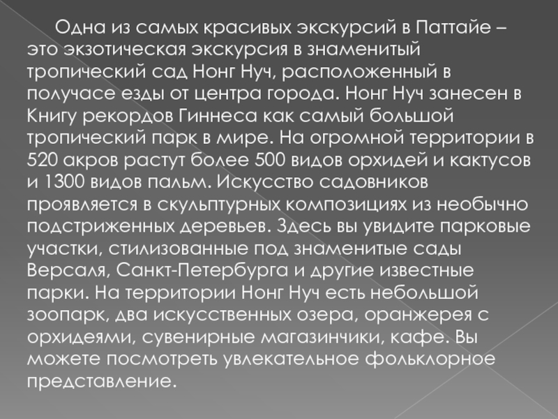в знаменитый тропический сад Нонг Нуч, расположенный в получасе езды от центра города. Нонг Нуч занесен в Книгу рекордов Гиннеса как самый большой тропический парк в мире. На огромной территории в 520 акров растут более 500 видов орхидей и кактусов и 1300 видов пальм. Искусство садовников проявляется в скульптурных композициях из необычно подстриженных деревьев. Здесь вы увидите парковые участки, стилизованные под знаменитые сады Версаля, Санкт-Петербурга и другие известные парки. На территории Нонг Нуч есть небольшой зоопарк, два искусственных озера, оранжерея с орхидеями, сувенирные магазинчики, кафе. Вы можете посмотреть увлекательное фольклорное представление.