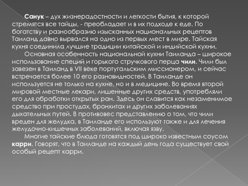 Основная особенность национальной кухни Таиланда – широкое использование специй и горького стручкового перца чили. Чили был завезен в Таиланд в VII веке португальским миссионером, и сейчас встречается более 10 его разновидностей. В Таиланде он используется не только на кухне, но и в медицине. Во время второй мировой местные лекари, лишенные других средств, употребляли его для обработки открытых ран. Здесь он славится как незаменимое средство при простудах, бронхитах и других заболеваниях дыхательных путей. В противовес представлению о том, что чили вреден для желудка, в Таиланде его используют также и для лечения желудочно-кишечных заболеваний, включая язву.