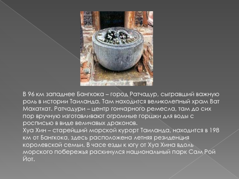 в истории Таиланда. Там находится великолепный храм Ват Махатхат. Ратчадури – центр гончарного ремесла, там до сих пор вручную изготавливают огромные горшки для воды с росписью в виде величавых драконов.