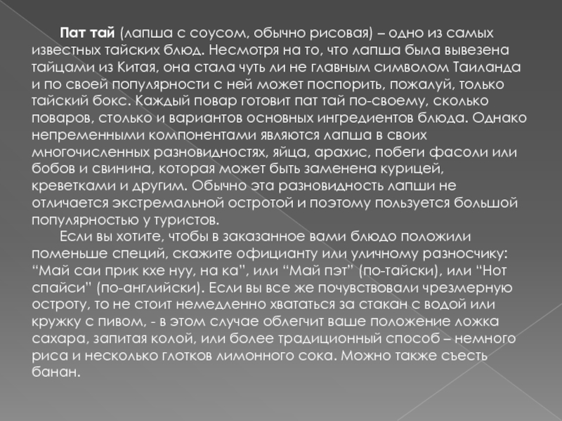 известных тайских блюд. Несмотря на то, что лапша была вывезена тайцами из Китая, она стала чуть ли не главным символом Таиланда и по своей популярности с ней может поспорить, пожалуй, только тайский бокс. Каждый повар готовит пат тай по-своему, сколько поваров, столько и вариантов основных ингредиентов блюда. Однако непременными компонентами являются лапша в своих многочисленных разновидностях, яйца, арахис, побеги фасоли или бобов и свинина, которая может быть заменена курицей, креветками и другим. Обычно эта разновидность лапши не отличается экстремальной остротой и поэтому пользуется большой популярностью у туристов.