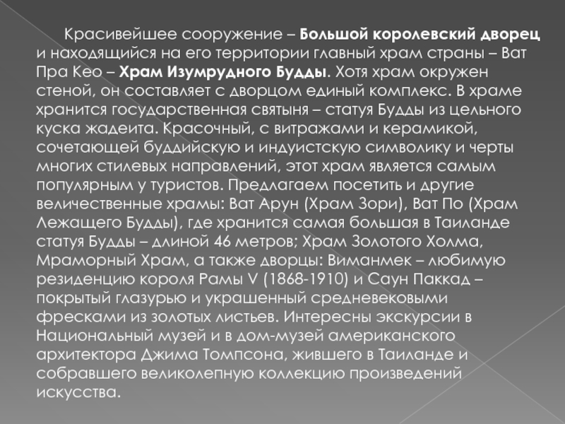 главный храм страны – Ват Пра Кео – Храм Изумрудного Будды. Хотя храм окружен стеной, он составляет с дворцом единый комплекс. В храме хранится государственная святыня – статуя Будды из цельного куска жадеита. Красочный, с витражами и керамикой, сочетающей буддийскую и индуистскую символику и черты многих стилевых направлений, этот храм является самым популярным у туристов. Предлагаем посетить и другие величественные храмы: Ват Арун (Храм Зори), Ват По (Храм Лежащего Будды), где хранится самая большая в Таиланде статуя Будды – длиной 46 метров; Храм Золотого Холма, Мраморный Храм, а также дворцы: Виманмек – любимую резиденцию короля Рамы V (1868-1910) и Саун Паккад – покрытый глазурью и украшенный средневековыми фресками из золотых листьев. Интересны экскурсии в Национальный музей и в дом-музей американского архитектора Джима Томпсона, жившего в Таиланде и собравшего великолепную коллекцию произведений искусства.