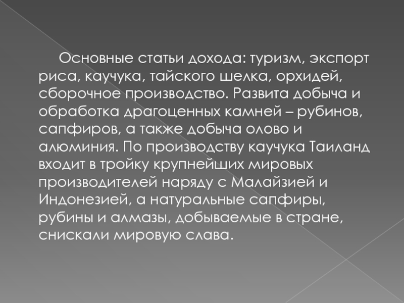 Слайд 11Основные статьи дохода: туризм, экспорт риса, каучука, тайского шелка, орхидей, сборочное