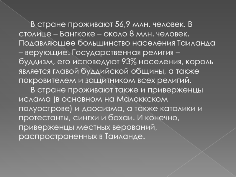 Слайд 9В стране проживают 56,9 млн. человек. В столице – Бангкоке –