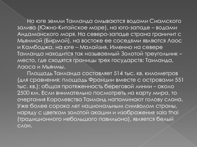 Площадь Таиланда составляет 514 тыс. кв. километров (для сравнения: площадь Франции вместе с островами 551 тыс. кв.); общая протяженность береговой линии – около 2500 км. Если внимательно посмотреть на карту мира, то очертания Королевства Таиланд напоминают голову слона. Уже более сорока лет национальным символом страны, наряду с цветком золотой акации и изображения sala thai (традиционного небольшого павильона), является белый слон.