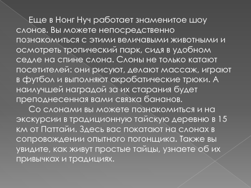 Слайд 47Еще в Нонг Нуч работает знаменитое шоу слонов. Вы можете непосредственно