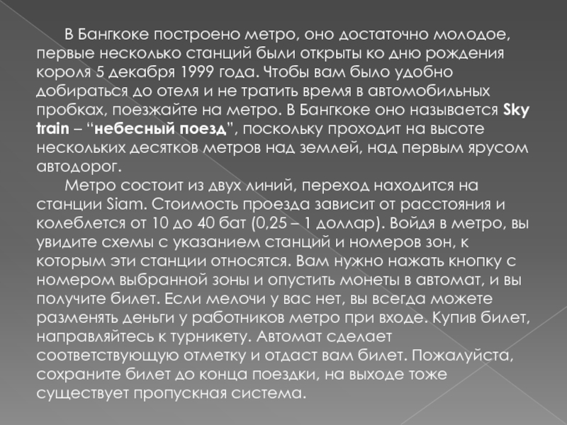 открыты ко дню рождения короля 5 декабря 1999 года. Чтобы вам было удобно добираться до отеля и не тратить время в автомобильных пробках, поезжайте на метро. В Бангкоке оно называется Sky train – “небесный поезд”, поскольку проходит на высоте нескольких десятков метров над землей, над первым ярусом автодорог.