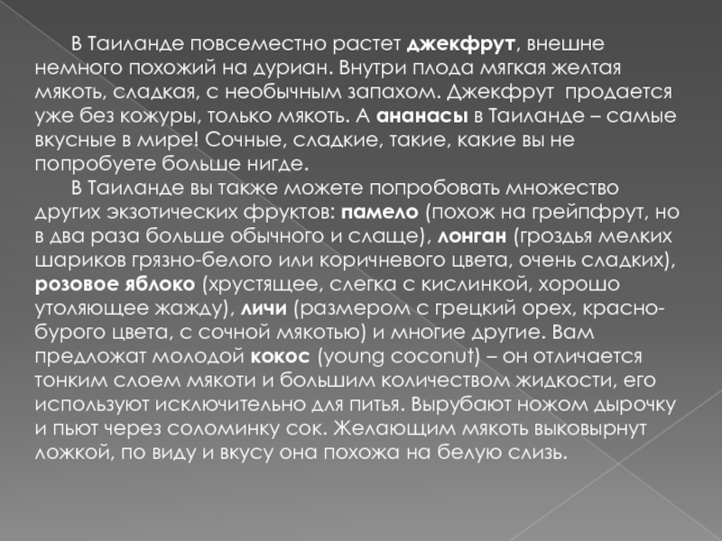 Слайд 81В Таиланде повсеместно растет джекфрут, внешне немного похожий на дуриан. Внутри