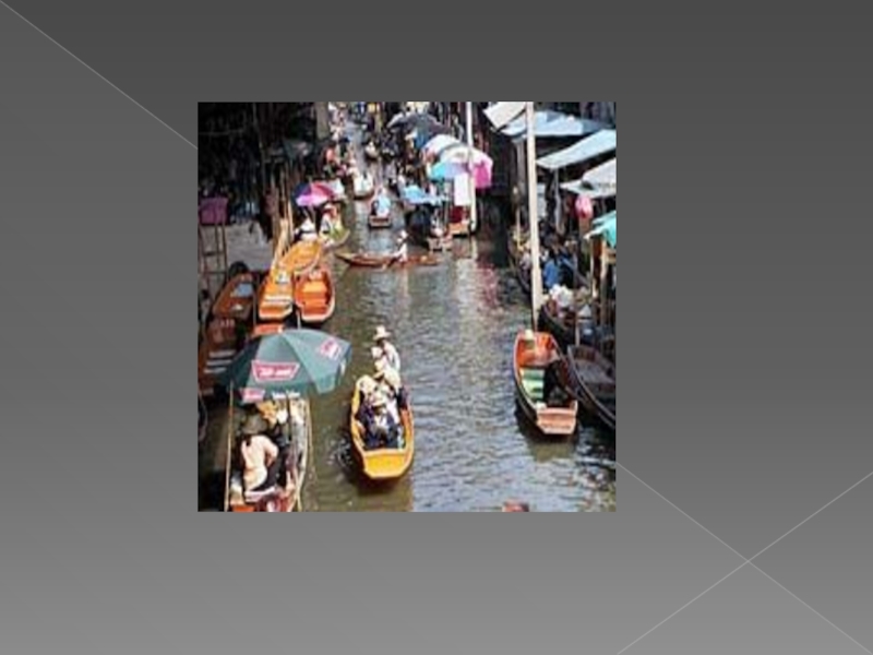 Слайд 83Улицы и каналы тайских городов уставлены лотками и тележками, торгующими разнообразными
