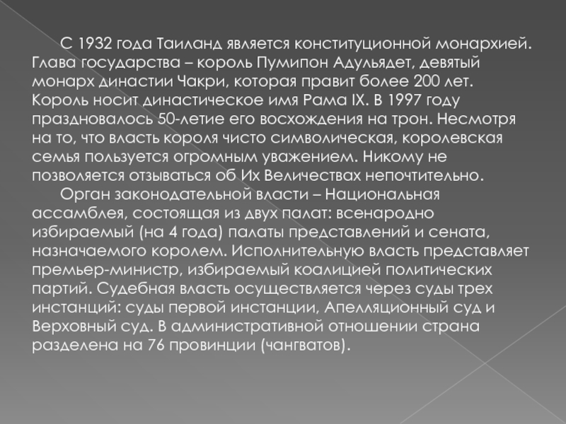 Слайд 14С 1932 года Таиланд является конституционной монархией. Глава государства – король