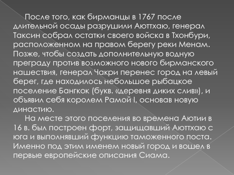 Слайд 22После того, как бирманцы в 1767 после длительной осады разрушили Аюттхаю,
