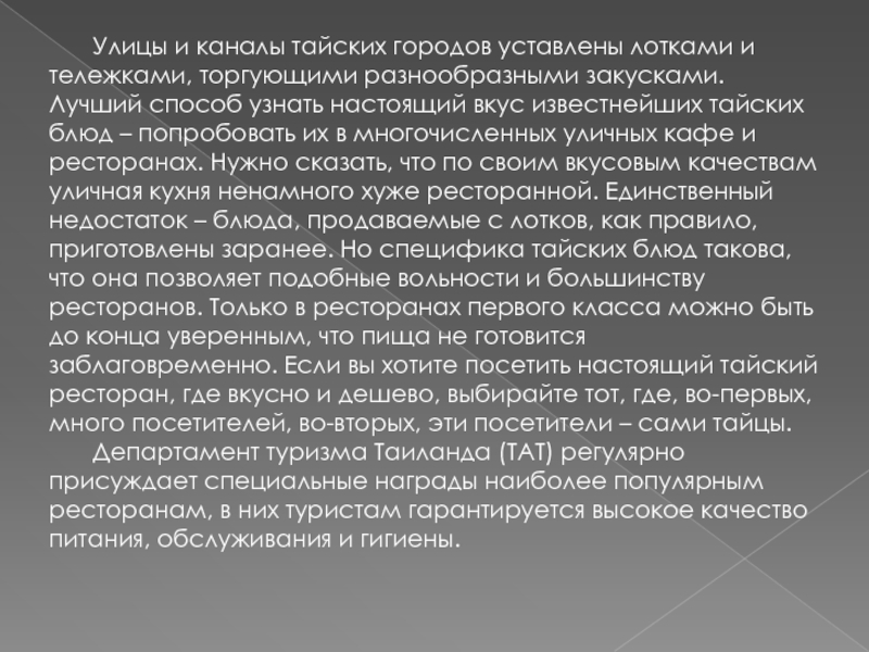 закусками. Лучший способ узнать настоящий вкус известнейших тайских блюд – попробовать их в многочисленных уличных кафе и ресторанах. Нужно сказать, что по своим вкусовым качествам уличная кухня ненамного хуже ресторанной. Единственный недостаток – блюда, продаваемые с лотков, как правило, приготовлены заранее. Но специфика тайских блюд такова, что она позволяет подобные вольности и большинству ресторанов. Только в ресторанах первого класса можно быть до конца уверенным, что пища не готовится заблаговременно. Если вы хотите посетить настоящий тайский ресторан, где вкусно и дешево, выбирайте тот, где, во-первых, много посетителей, во-вторых, эти посетители – сами тайцы.