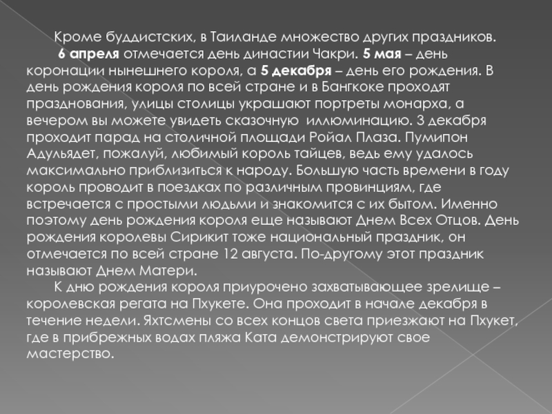 Чакри. 5 мая – день коронации нынешнего короля, а 5 декабря – день его рождения. В день рождения короля по всей стране и в Бангкоке проходят празднования, улицы столицы украшают портреты монарха, а вечером вы можете увидеть сказочную иллюминацию. 3 декабря проходит парад на столичной площади Ройал Плаза. Пумипон Адульядет, пожалуй, любимый король тайцев, ведь ему удалось максимально приблизиться к народу. Большую часть времени в году король проводит в поездках по различным провинциям, где встречается с простыми людьми и знакомится с их бытом. Именно поэтому день рождения короля еще называют Днем Всех Отцов. День рождения королевы Сирикит тоже национальный праздник, он отмечается по всей стране 12 августа. По-другому этот праздник называют Днем Матери.