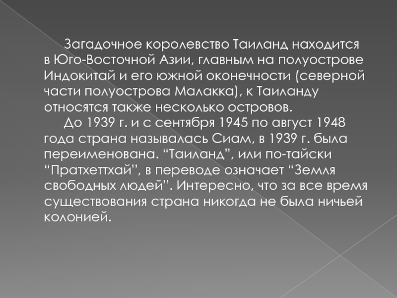 До 1939 г. и с сентября 1945 по август 1948 года страна называлась Сиам, в 1939 г. была переименована. “Таиланд”, или по-тайски “Пратхеттхай”, в переводе означает “Земля свободных людей”. Интересно, что за все время существования страна никогда не была ничьей колонией.