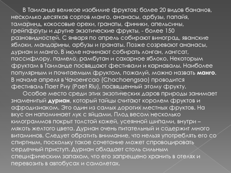 сортов манго, ананасы, арбузы, папайя, тамаринд, кокосовые орехи, гранаты, финики, апельсины, грейпфруты и другие экзотические фрукты, - более 150 разновидностей. С января по апрель собирают виноград, яванские яблоки, мандарины, арбузы и гранаты. Позже созревают ананасы, дуриан и манго. В июле начинают собирать лонган, лангсат, пассифлору, памело, рамбутан и сахарное яблоко. Некоторым фруктам в Таиланде посвящают фестивали и карнавалы. Наиболее популярным и почитаемым фруктом, пожалуй, можно назвать манго. В начале апреля в Чачоенгсао (Chachoengsao) проводится фестиваль Пает Риу (Paet Riu), посвященный этому фрукту.