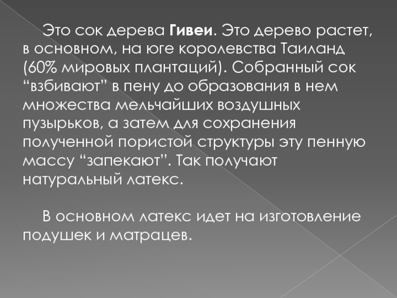 королевства Таиланд (60% мировых плантаций). Собранный сок “взбивают” в пену до образования в нем множества мельчайших воздушных пузырьков, а затем для сохранения полученной пористой структуры эту пенную массу “запекают”. Так получают натуральный латекс.