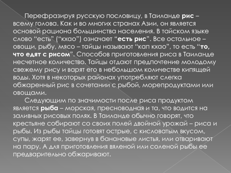 во многих странах Азии, он является основой рациона большинства населения. В тайском языке слово “есть” (“кхао”) означает “есть рис”. Все остальное – овощи, рыбу, мясо – тайцы называют “кап кхао”, то есть “то, что едят с рисом”. Способов приготовления риса в Таиланде несчетное количество. Тайцы отдают предпочтение молодому свежему рису и варят его в небольшом количестве кипящей воды. Хотя в некоторых районах употребляют слегка обжаренный рис в сочетании с рыбой, морепродуктами или овощами.
