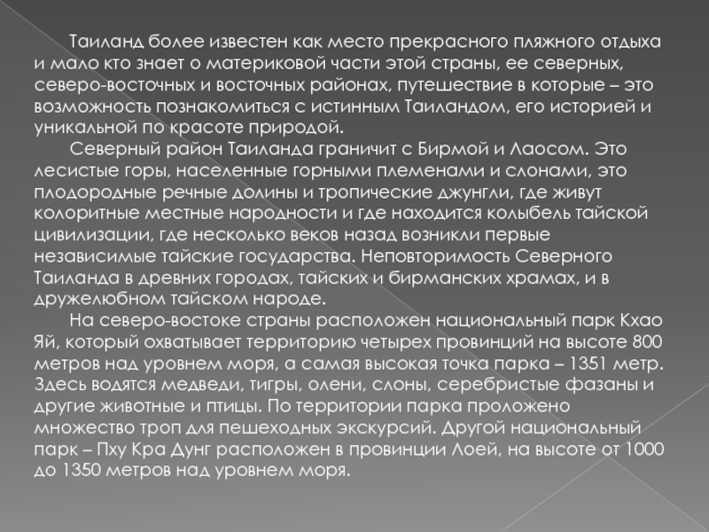 знает о материковой части этой страны, ее северных, северо-восточных и восточных районах, путешествие в которые – это возможность познакомиться с истинным Таиландом, его историей и уникальной по красоте природой.