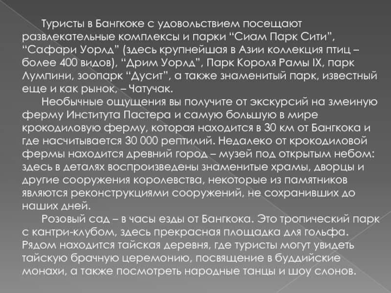 Парк Сити”, “Сафари Уорлд” (здесь крупнейшая в Азии коллекция птиц – более 400 видов), “Дрим Уорлд”, Парк Короля Рамы IX, парк Лумпини, зоопарк “Дусит”, а также знаменитый парк, известный еще и как рынок, – Чатучак.