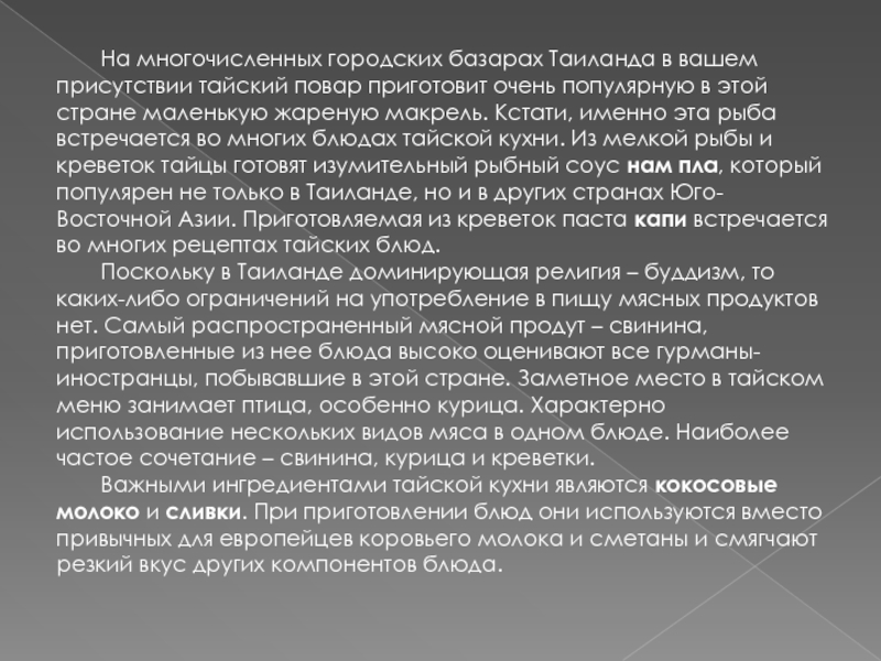очень популярную в этой стране маленькую жареную макрель. Кстати, именно эта рыба встречается во многих блюдах тайской кухни. Из мелкой рыбы и креветок тайцы готовят изумительный рыбный соус нам пла, который популярен не только в Таиланде, но и в других странах Юго-Восточной Азии. Приготовляемая из креветок паста капи встречается во многих рецептах тайских блюд.