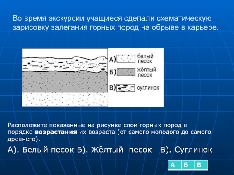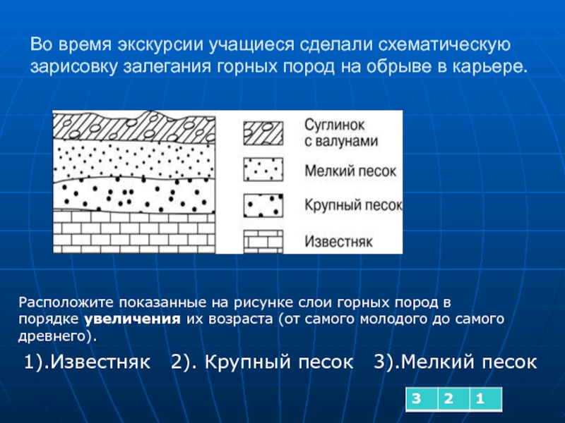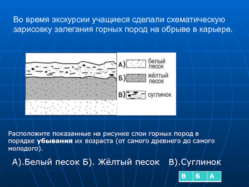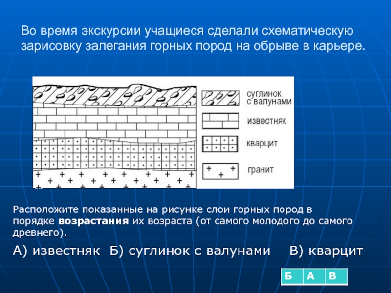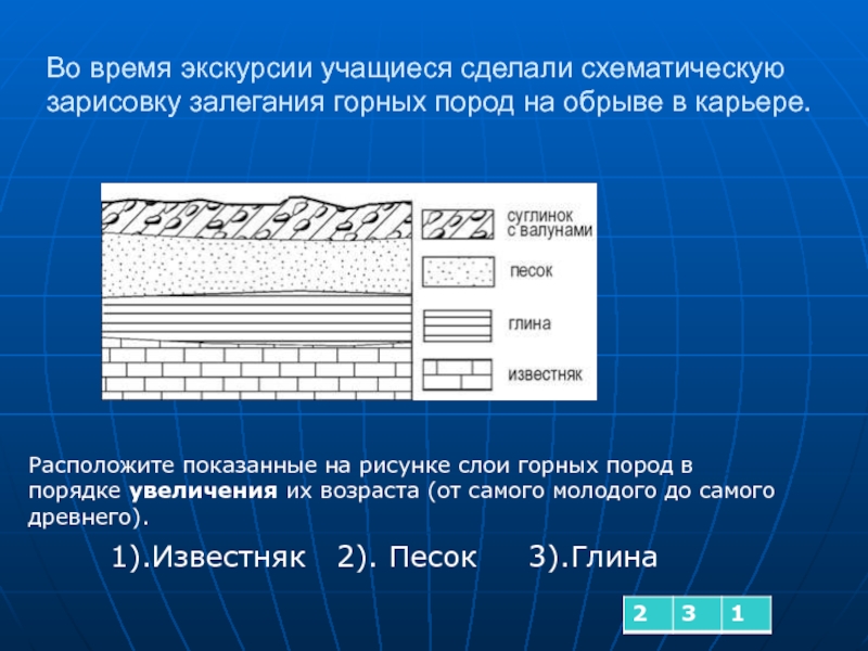 Расположите показанные на рисунке слои горных пород в порядке убывания их возраста (от самого древнего до самого молодого).