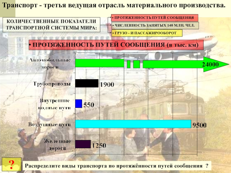 Распределите виды транспорта по протяжённости путей сообщения ?