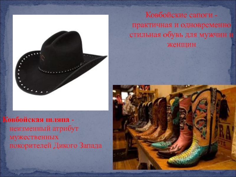 Слайд 29Ковбойские сапоги - практичная и одновременно стильная обувь для мужчин и женщин