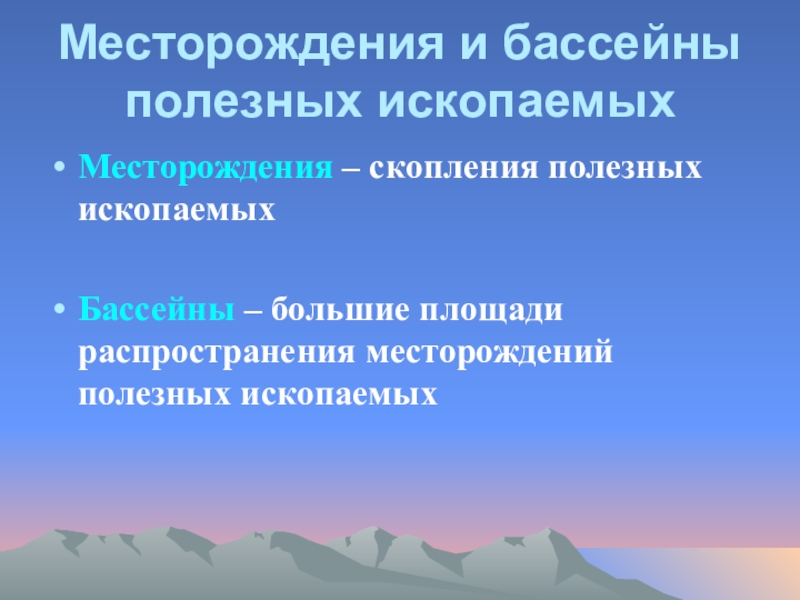 Месторождения и бассейны полезных ископаемых Месторождения – скопления полезных ископаемыхБассейны – большие площади распространения месторождений полезных