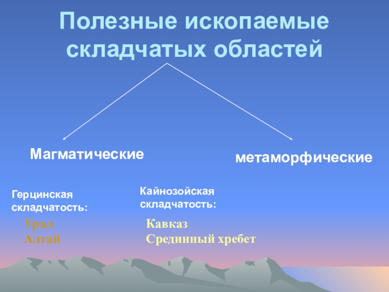Полезные ископаемые складчатых областей МагматическиеметаморфическиеГерцинская складчатость:УралАлтайКайнозойскаяскладчатость:КавказСрединный хребет
