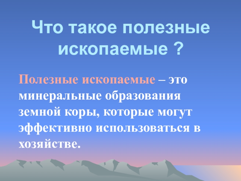 Что такое полезные ископаемые ?Полезные ископаемые – это минеральные образования земной коры, которые могут эффективно использоваться в