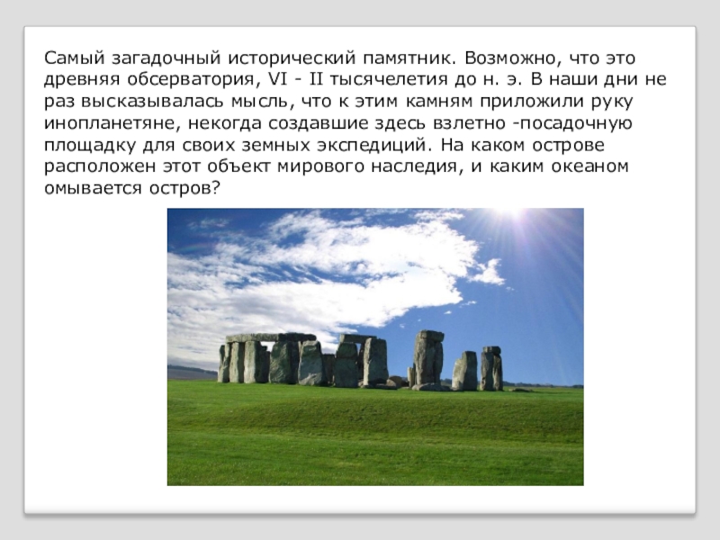 II тысячелетия до н. э. В наши дни не раз высказывалась мысль, что к этим камням приложили руку инопланетяне, некогда создавшие здесь взлетно -посадочную площадку для своих земных экспедиций. На каком острове расположен этот объект мирового наследия, и каким океаном омывается остров?